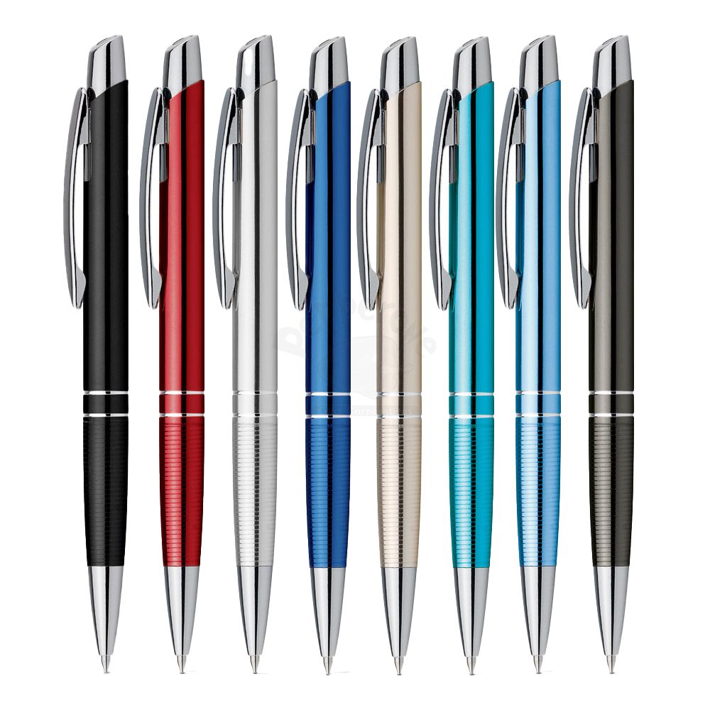 Esferográfica em alumínio com clipe. Disponível numa variada gama de cores. Escrita em azul