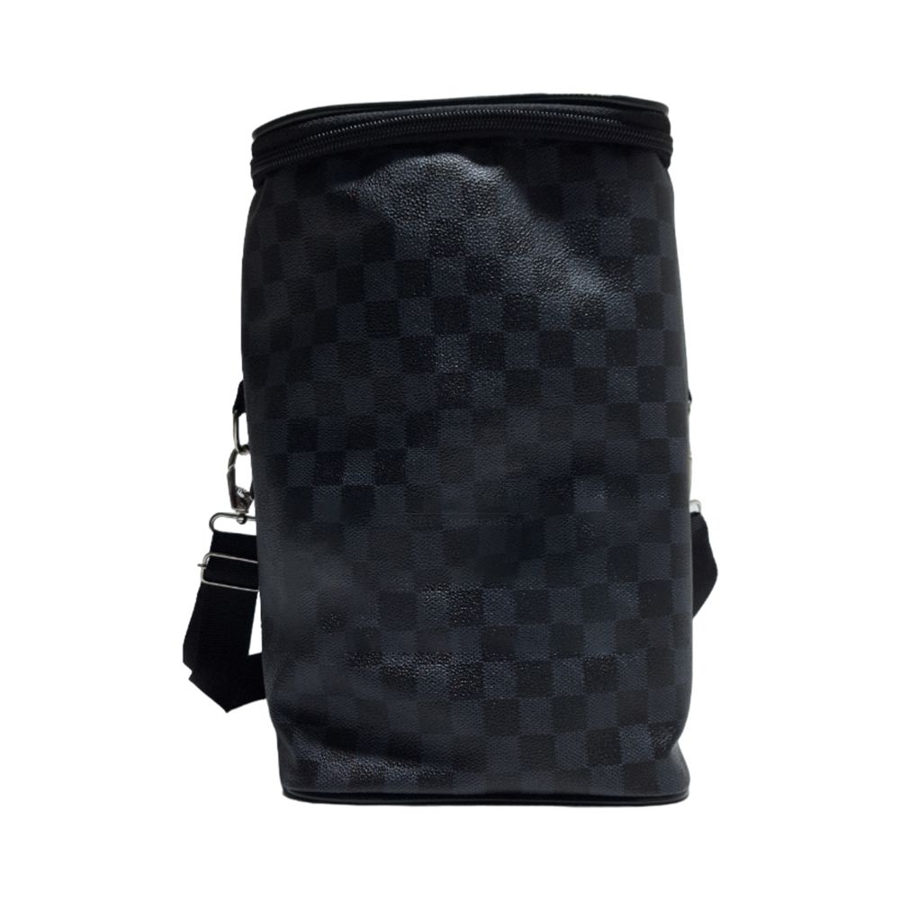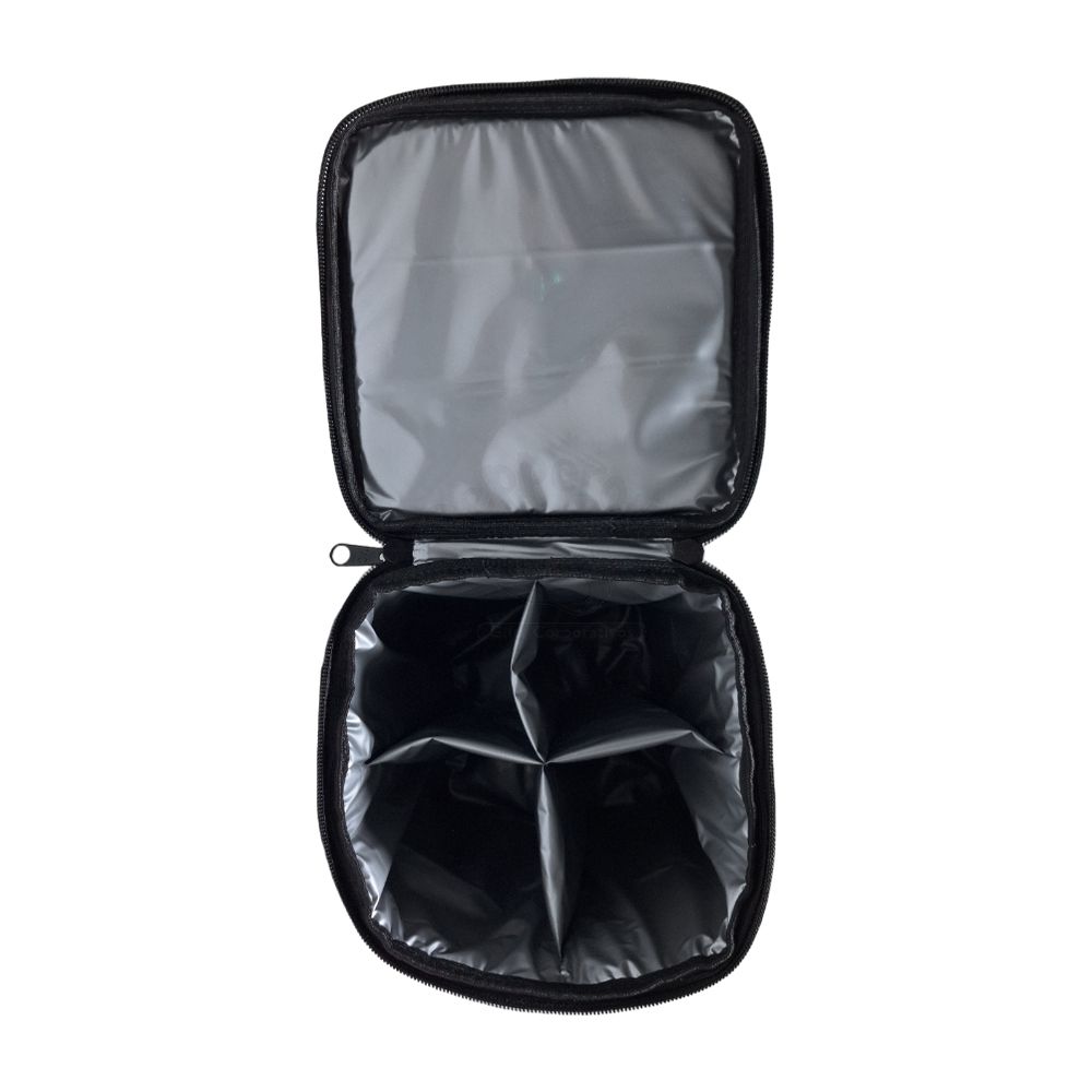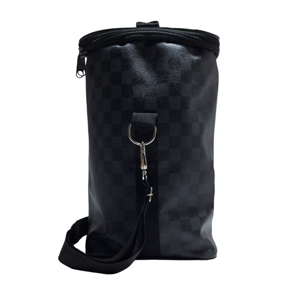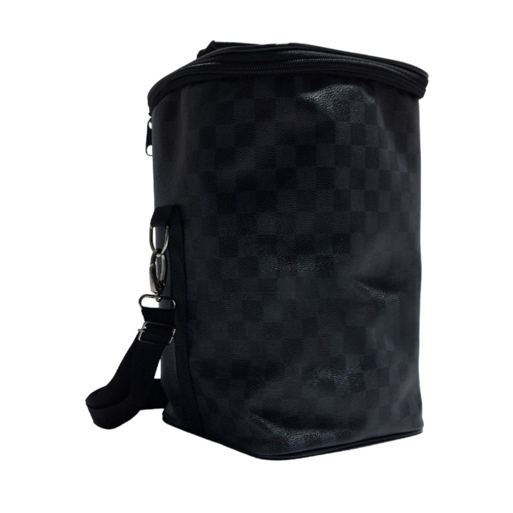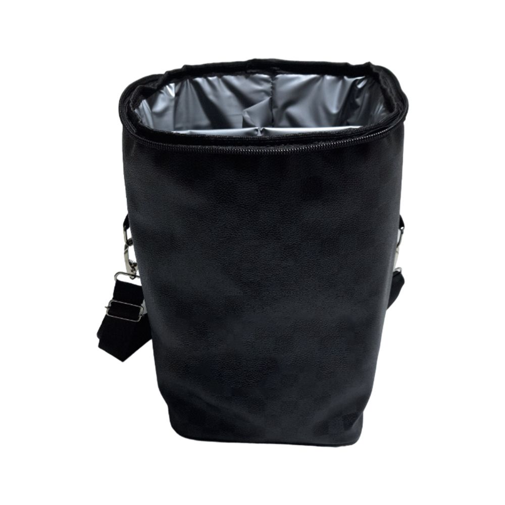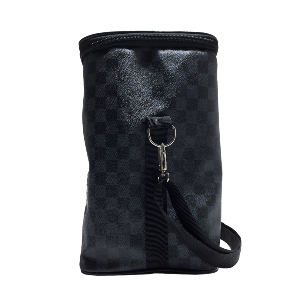 Porta vinho personalizado produzido em couro sintético com compartimentos para 4 garrafas e alça transversal reguladora.