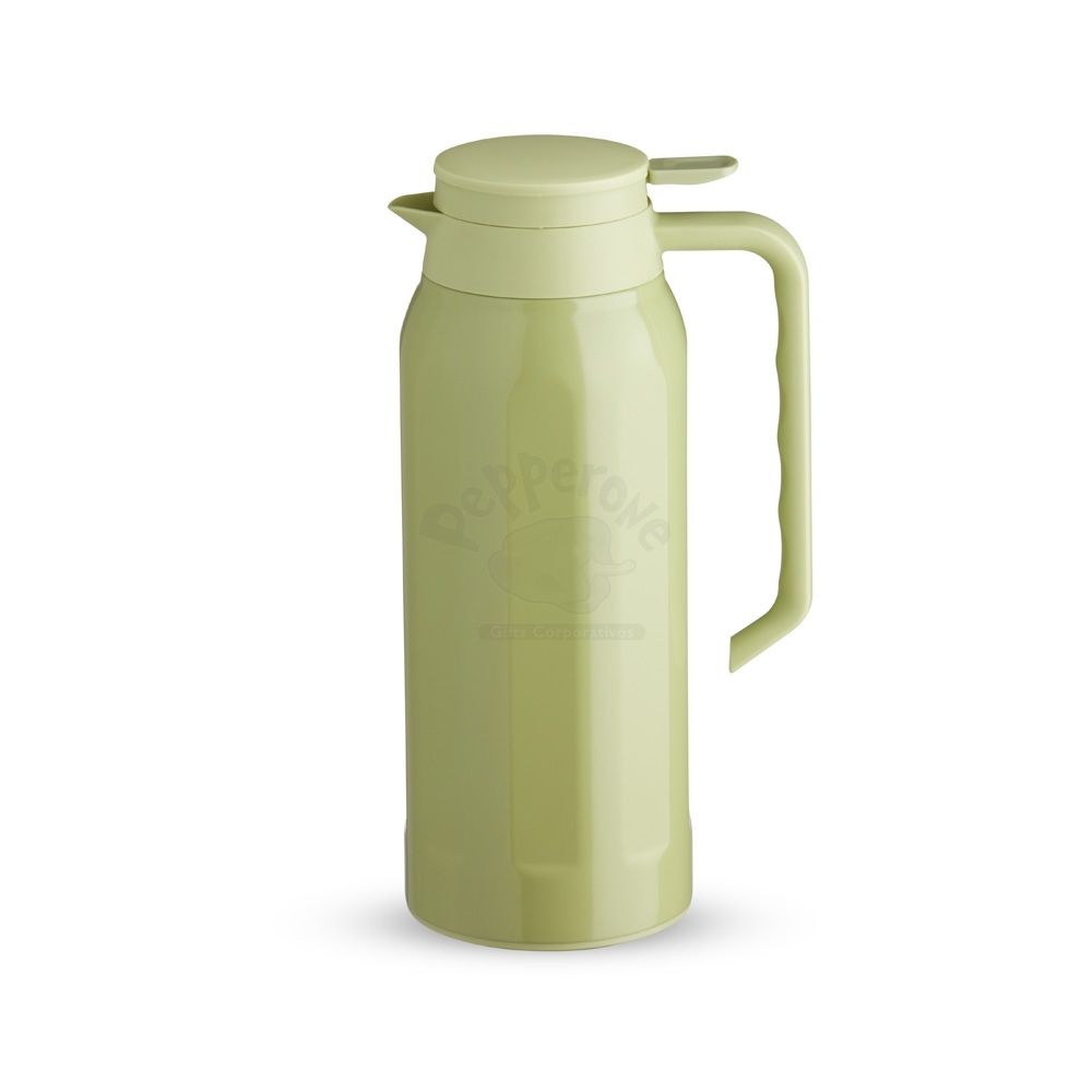 Garrafa térmica com capacidade de 1,4 litros, fabricada em aço inoxidável, possui parede dupla e tampa com alavanca de acionamento. Com tampa, alça e base plásticas, a garrafa possui um design com ondulações em relevo e acabamento brilhante.