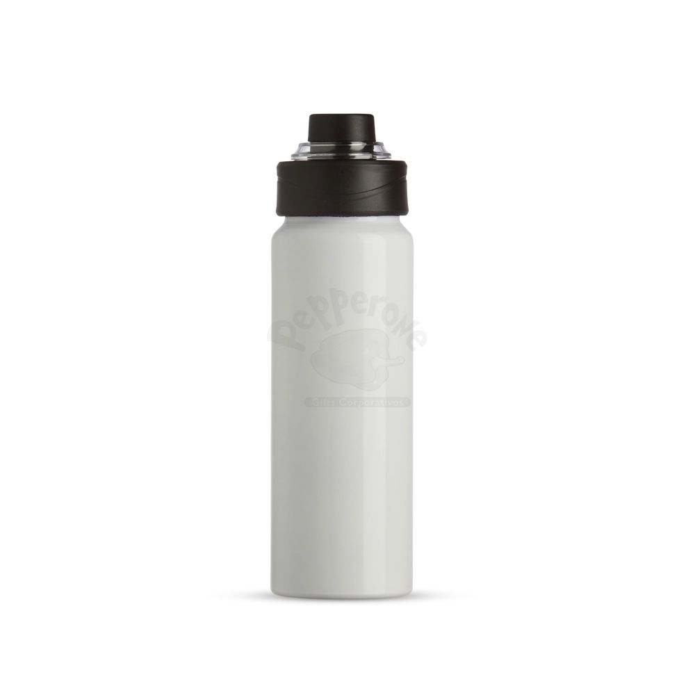 Squeeze Alumínio 800ml, possui tampa rosqueável com proteção para bocal plástica e alças de nylon e plástica.