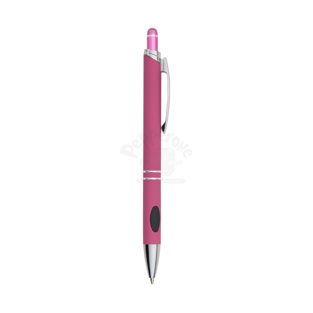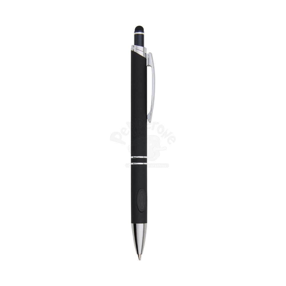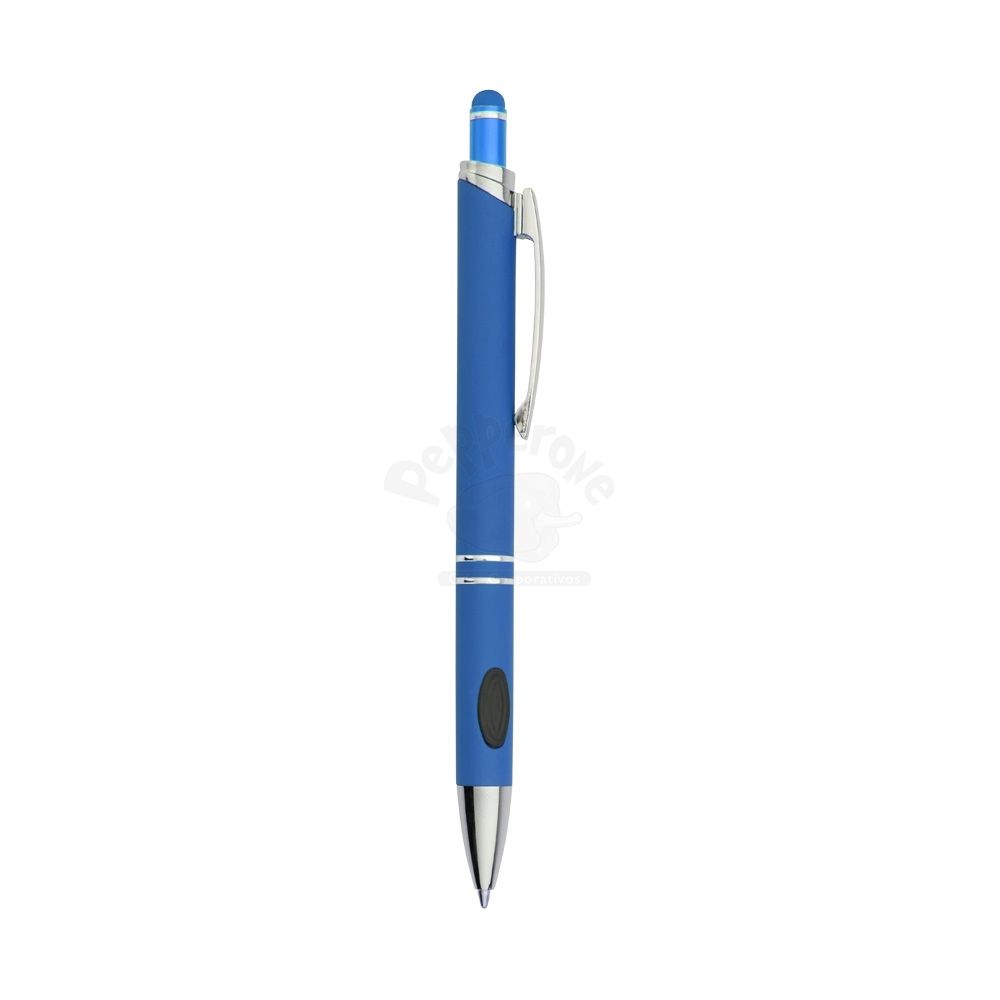 Caneta metálica touchscreen com acabamento emborrachado, acionamento por clique e carga esferográfica azul 1.0mm.