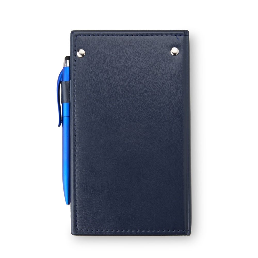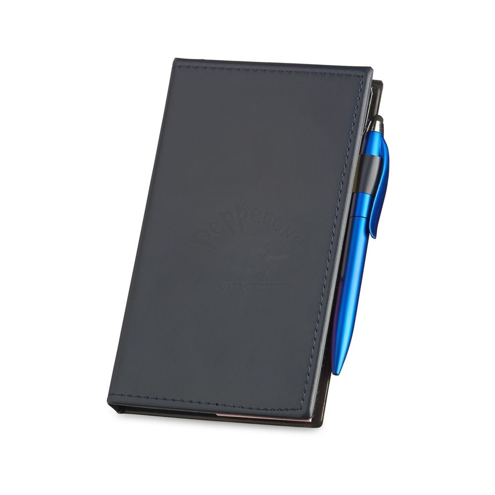 Kit para anotações em couro sintético com autoadesivos e caneta plástica. Contém 3 blocos com aproximadamente 50 folhas, conjunto de 5 marcadores plásticos autoadesivos com aproximadamente 25 folhas e caneta plástica touchscreen com carga esferográfica azul 1.0mm e acionamento por rotação.