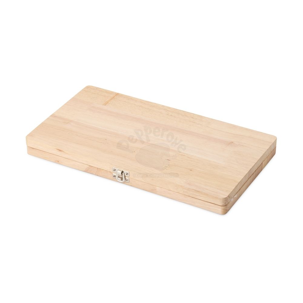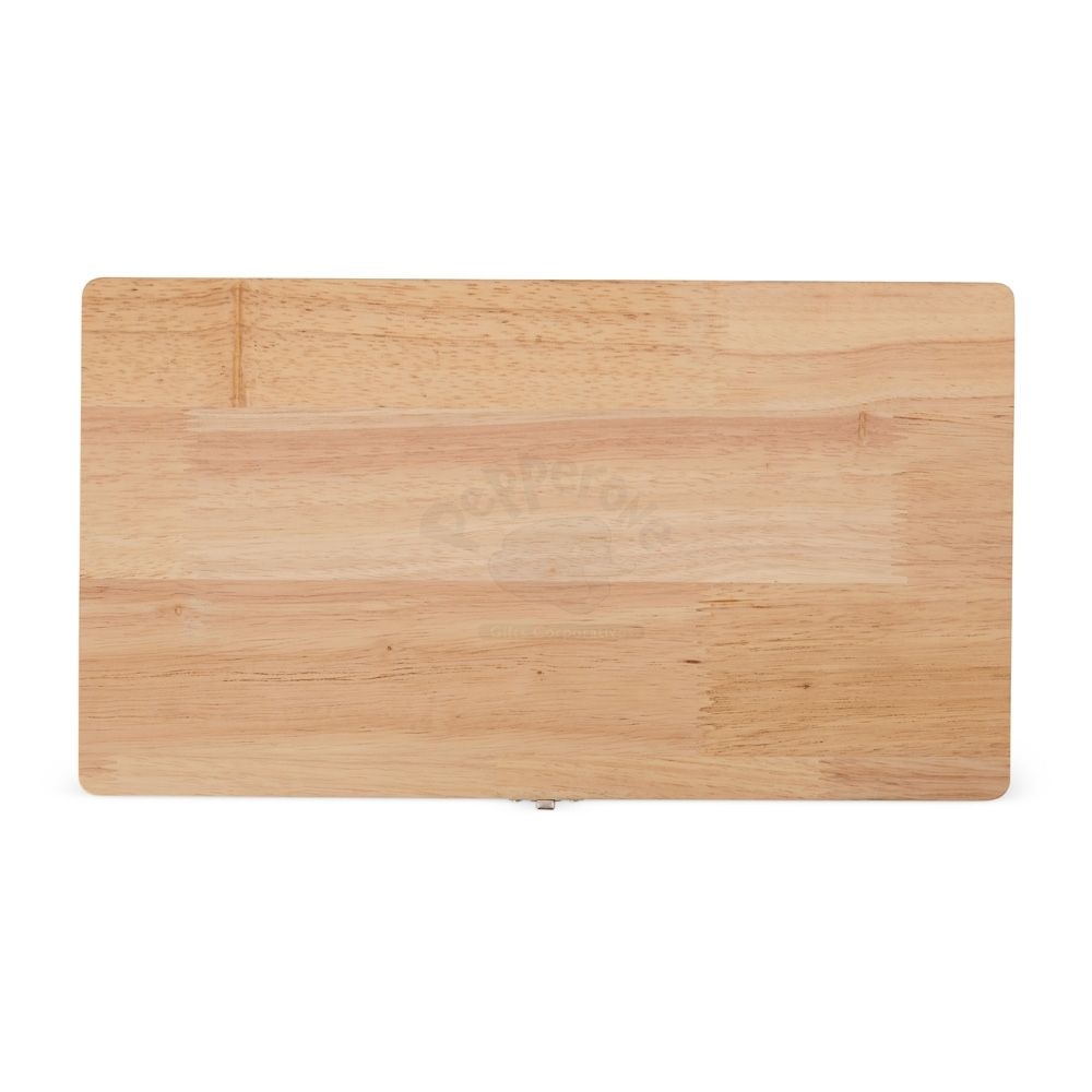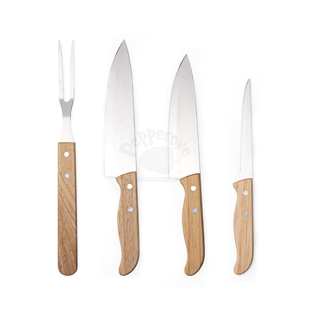 Kit churrasco 4 peças em estojo de madeira. Contém três facas e um garfo.