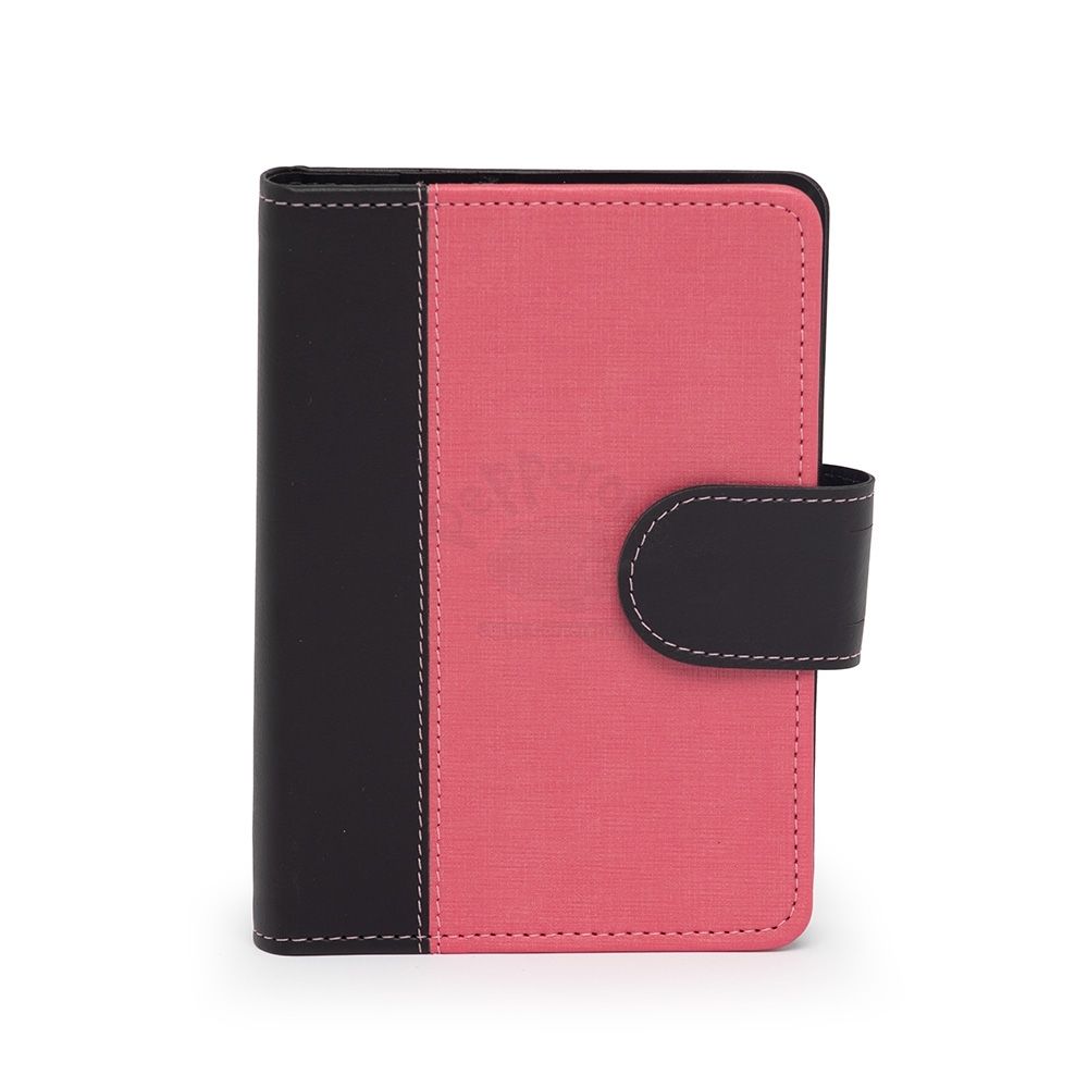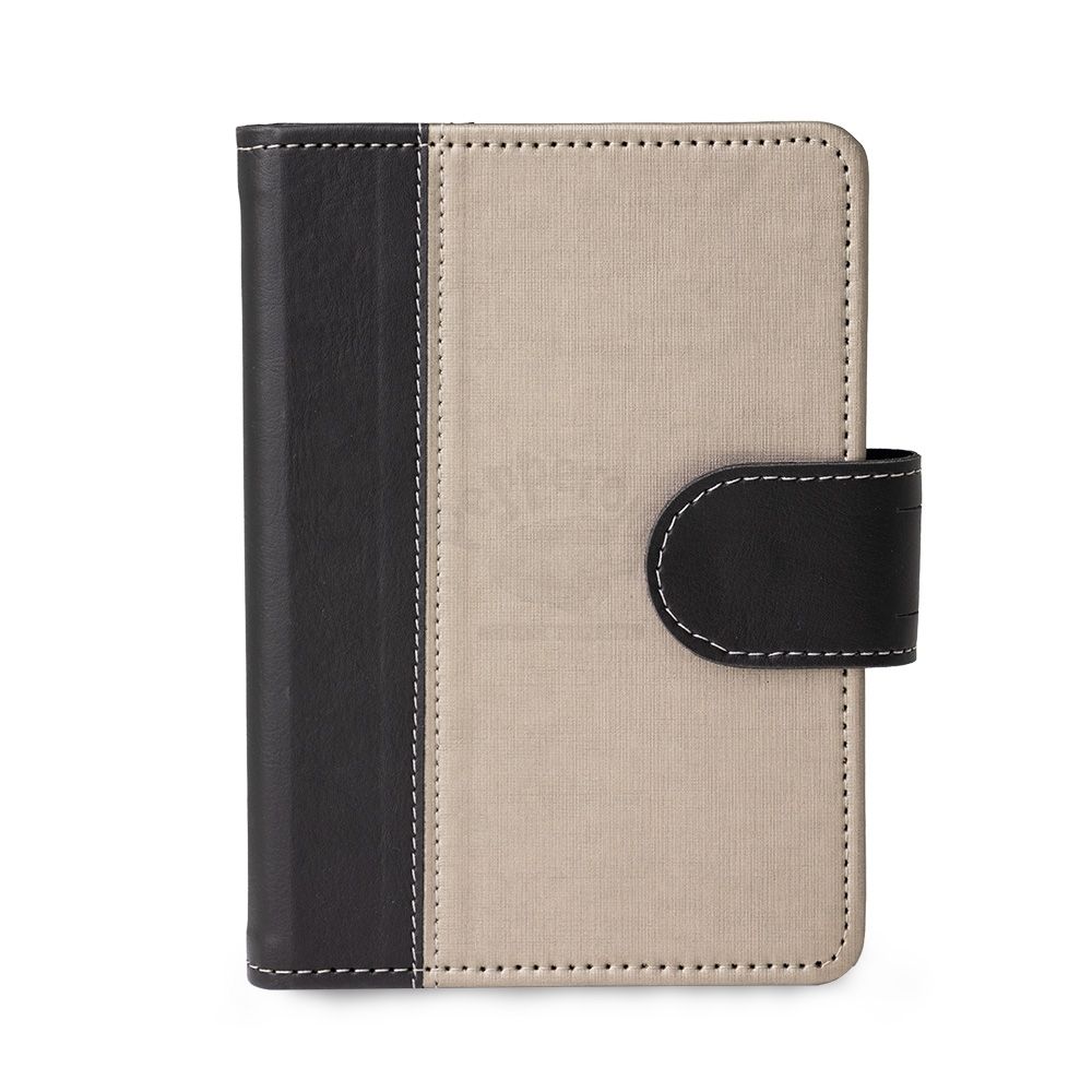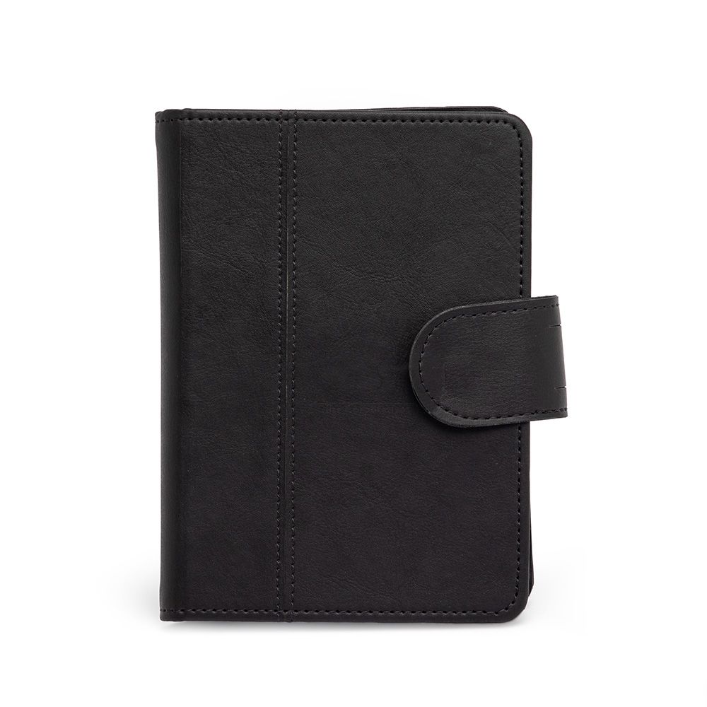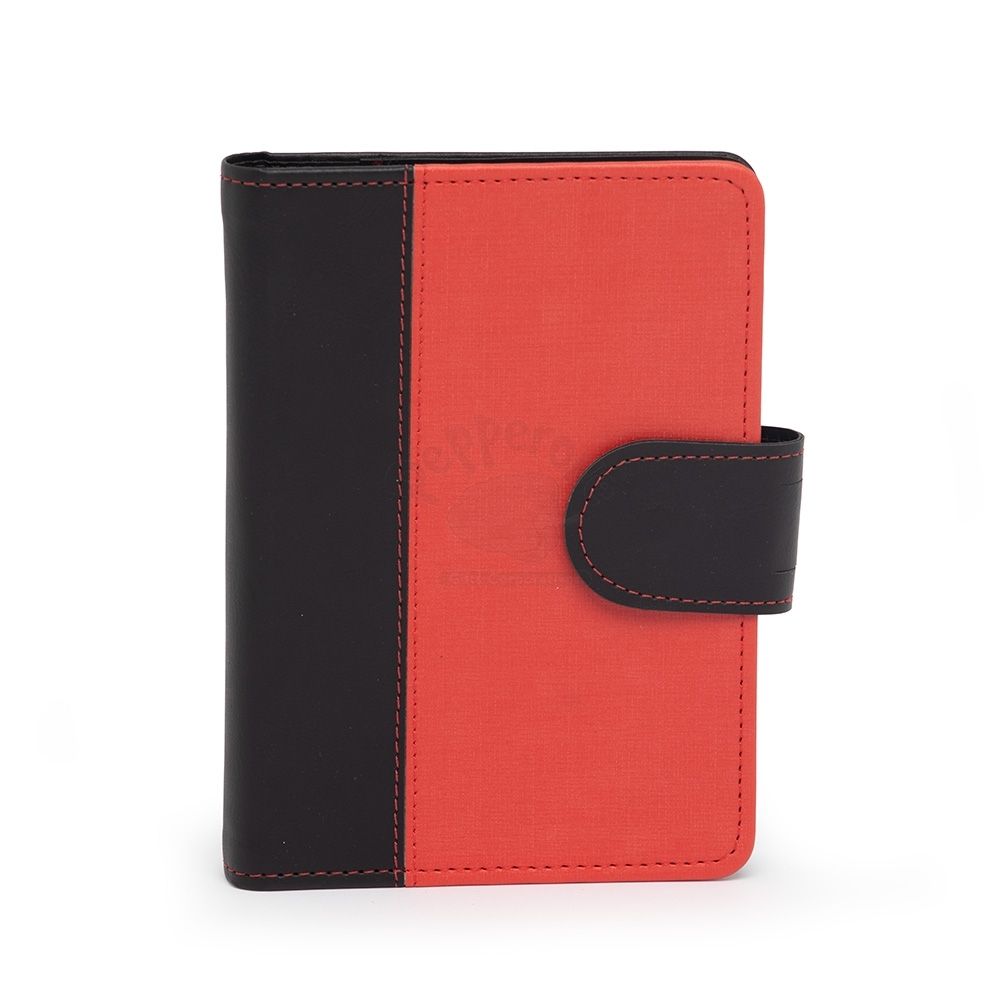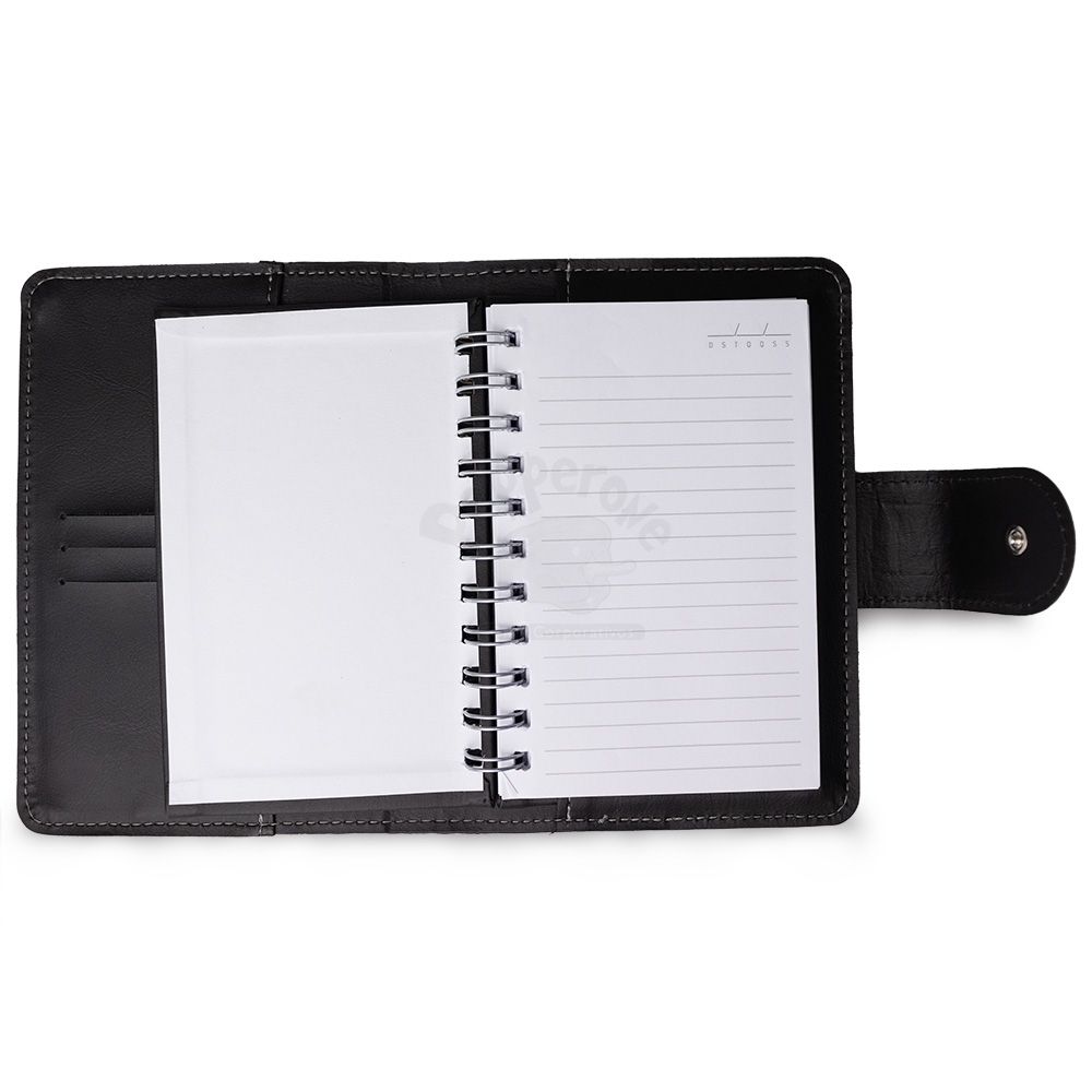 Caderneta de couro sintético com fechamento de botão. Possui caderno capa dura em couro sintético com aproximadamente 100 folhas pautadas, divisórias para cartões e bolso lateral.