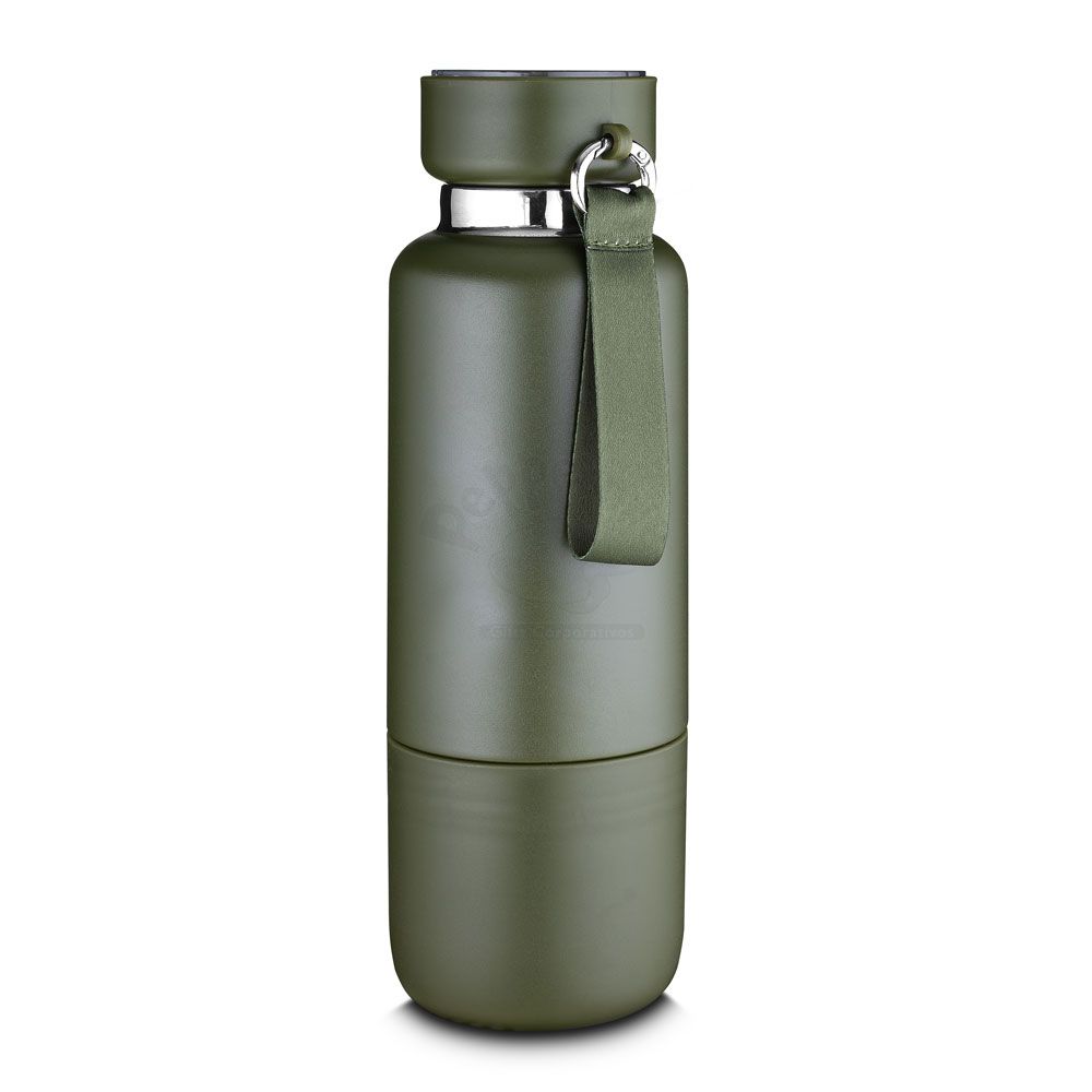 Garrafa térmica em aço inox com parede dupla isolada a vácuo com acabamento na parte externa em tinta pó. Capacidade de 500ml e cordão tipo mosquetão. Tampa rosqueável, vedada por um anel de silicone. Possui copo adicional rosqueável na parte inferior da garrafa. Parte superior da tampa acompanha um cordão adicional de 68cm para substituição. Permitindo uso do compartimento para pequenos objetos.