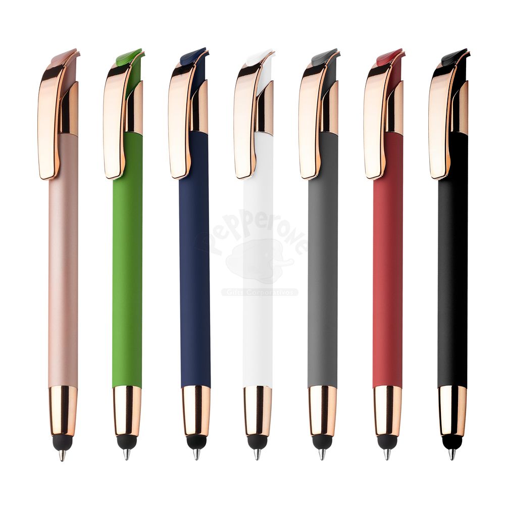 Caneta esferográfica em alumínio reciclavel com escrita em azul. Refil tipo parker e ponta touch emborrachada.