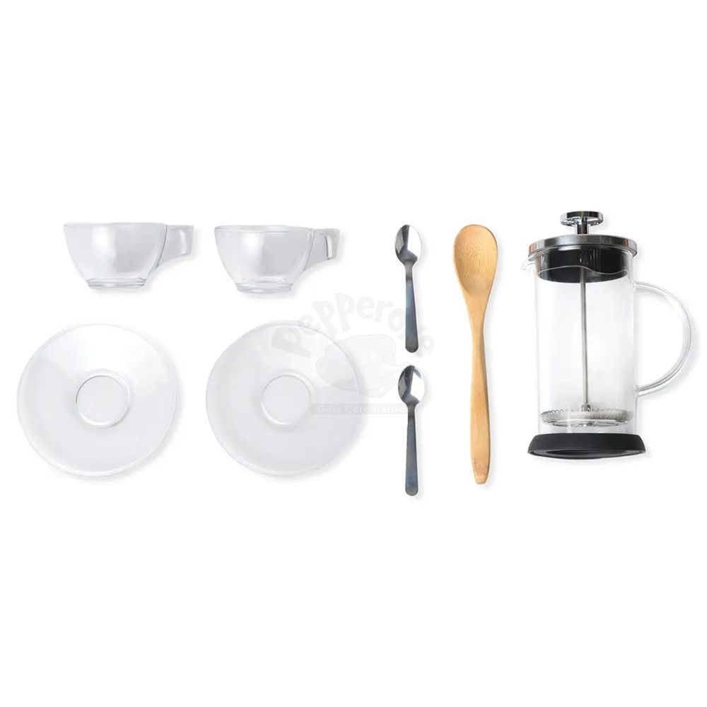 Cafeteira prensa francesa em vidro, duas xícaras com pires em vidro, duas colheres em inox e uma colher em bambu de 18 cm.