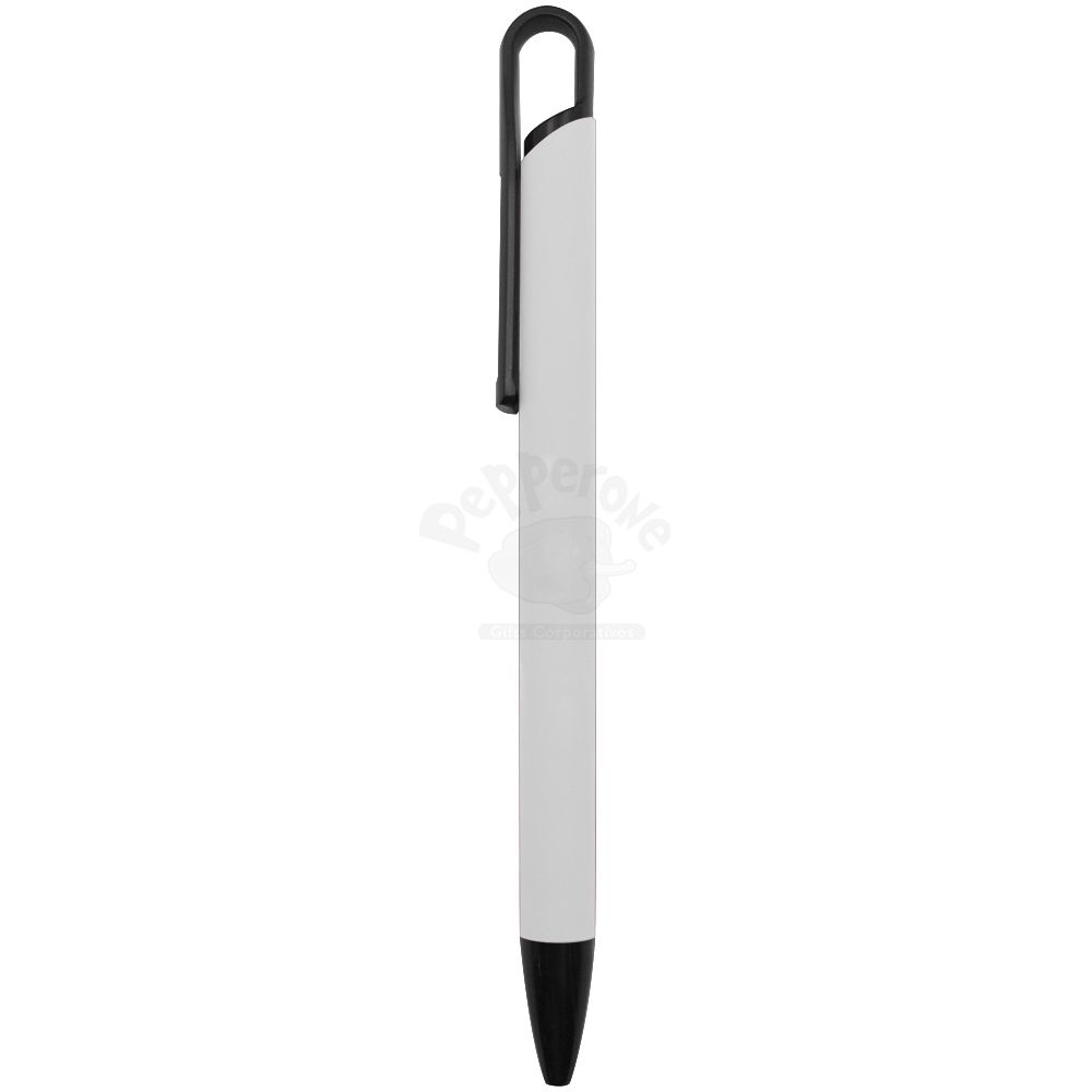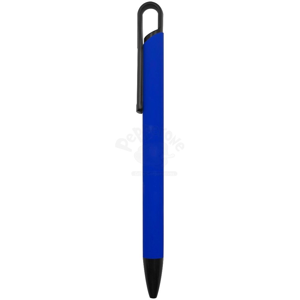 Caneta cilíndrica em metal com acabamento emborrachado cor e acionamento por clique e carga na cor azul.