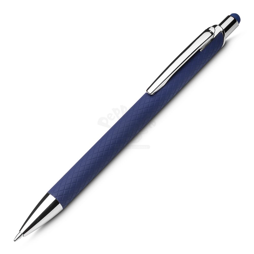 Caneta esferográfica em alumínio reciclavel com escrita em azul. Refil tipo parker e ponta touch emborrachada.