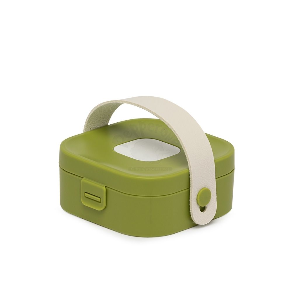 Porta-joias com espelho, produzido em plástico com alça de couro sintético e berço de silicone removível.