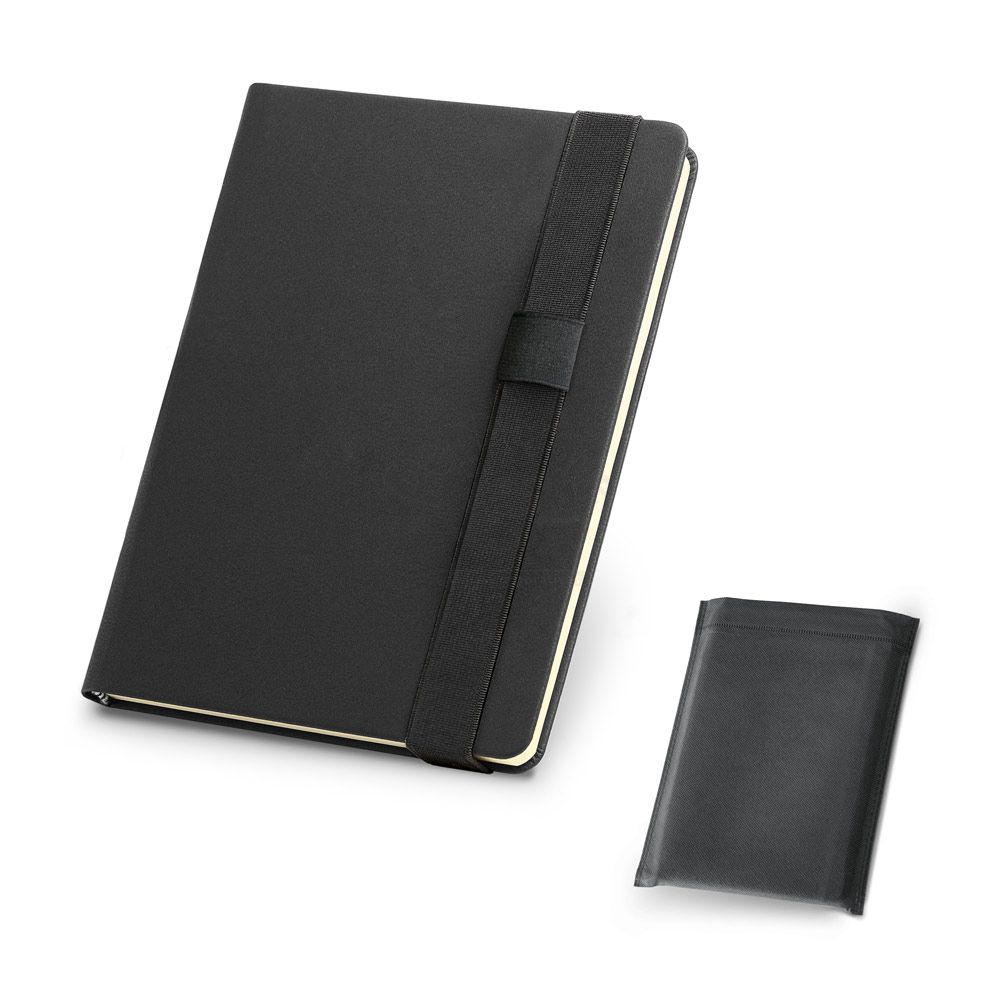 Caderno A5 de capa dura em couro sintético e 140 folhas lisas em cor marfim. Fornecido em bolsa de non-woven.