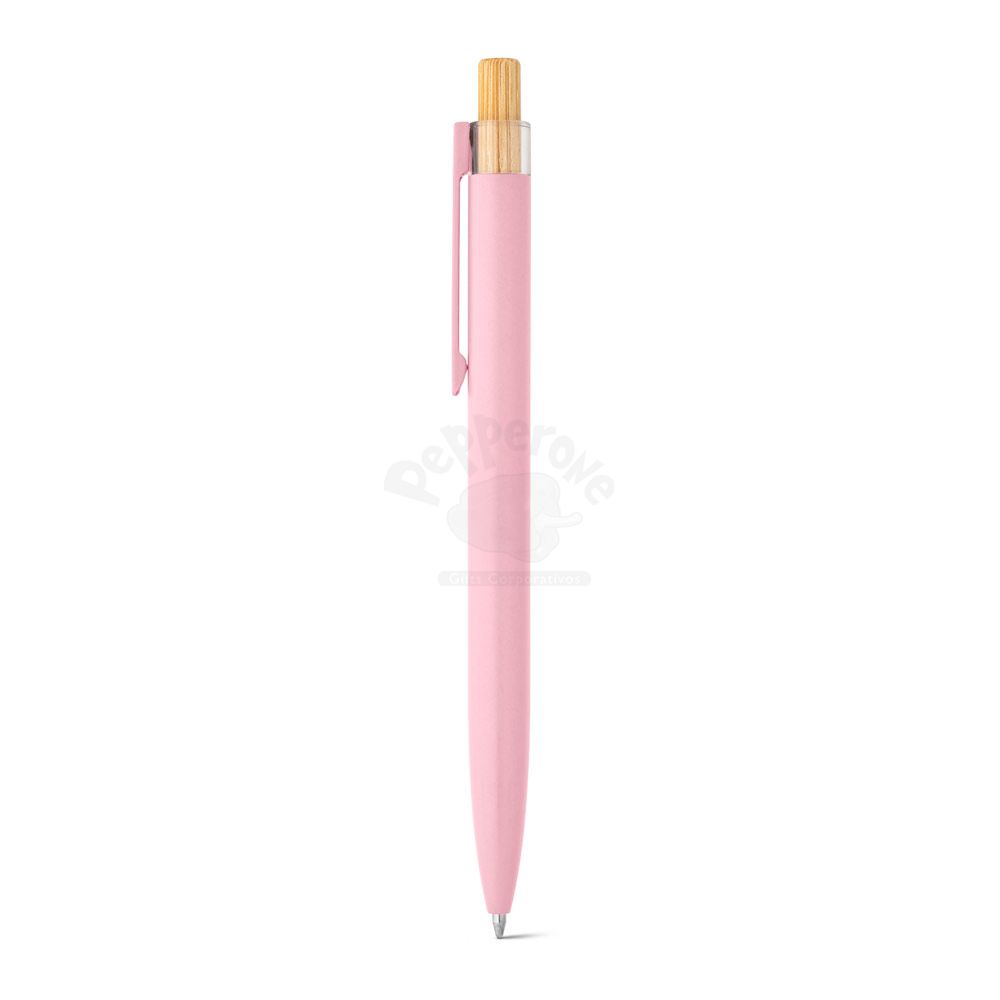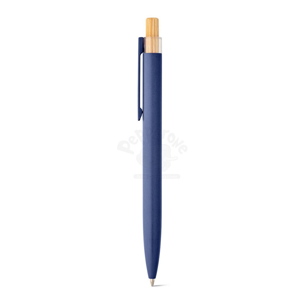 Esferográfica com corpo em alumínio 100% reciclado, topo em 100% rPET, botão em bambu e clipe de metal. Escrita em azul. A cor e o resultado da impressão nos materiais naturais pode variar entre produtos.