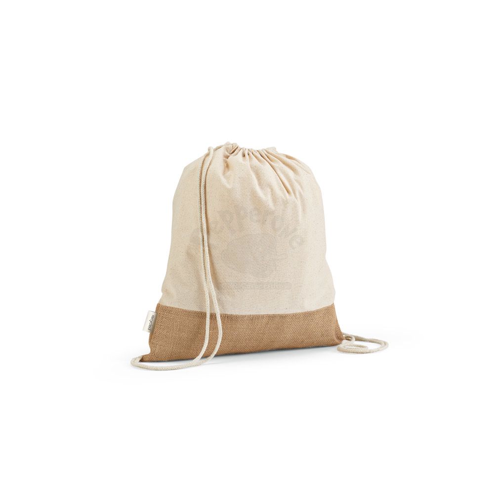 Sacola tipo mochila em 70% algodão reciclado e 30% poliéster reciclado (180 g/m²) com base em juta. Alças em algodão.