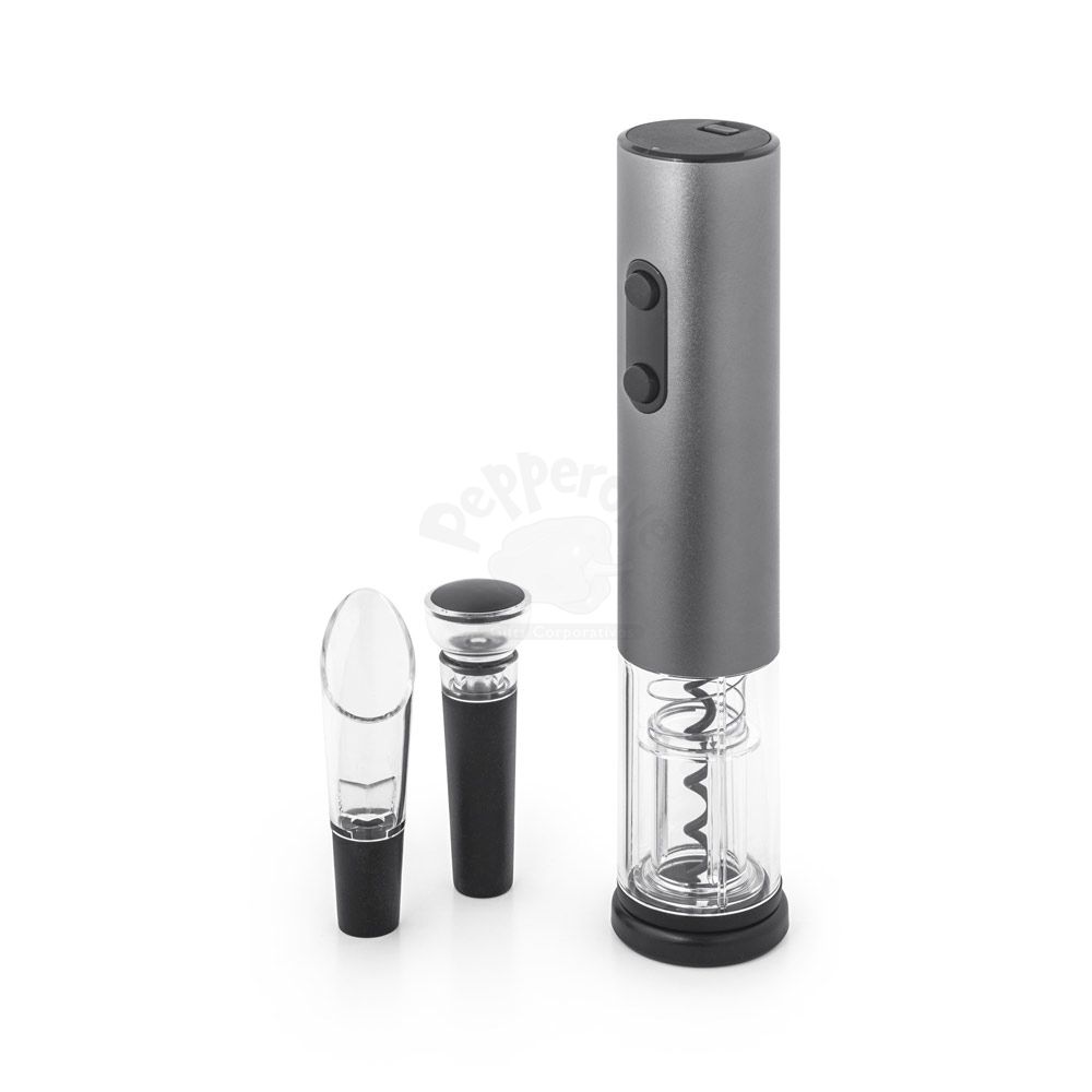 Conjunto de saca-rolhas elétrico em alumínio e acessórios: corta-cápsulas, rolha de vácuo e salva-gotas (pilhas inclusas). Fornecido em caixa presente.