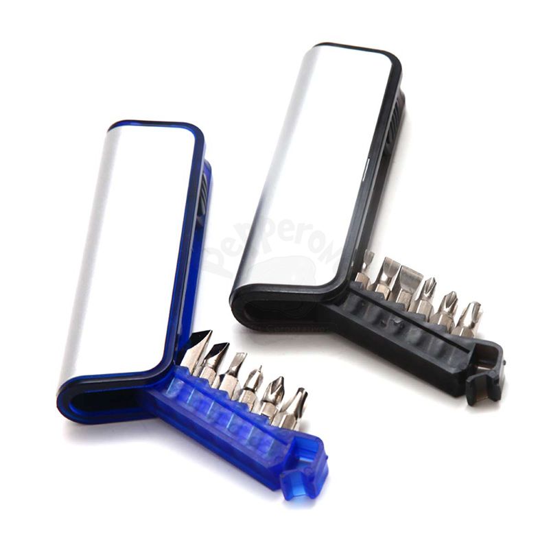Kit ferramenta com 6 funções e lanterna, material de plástico com alumínio. Embalagem, caixa de papelão branca.