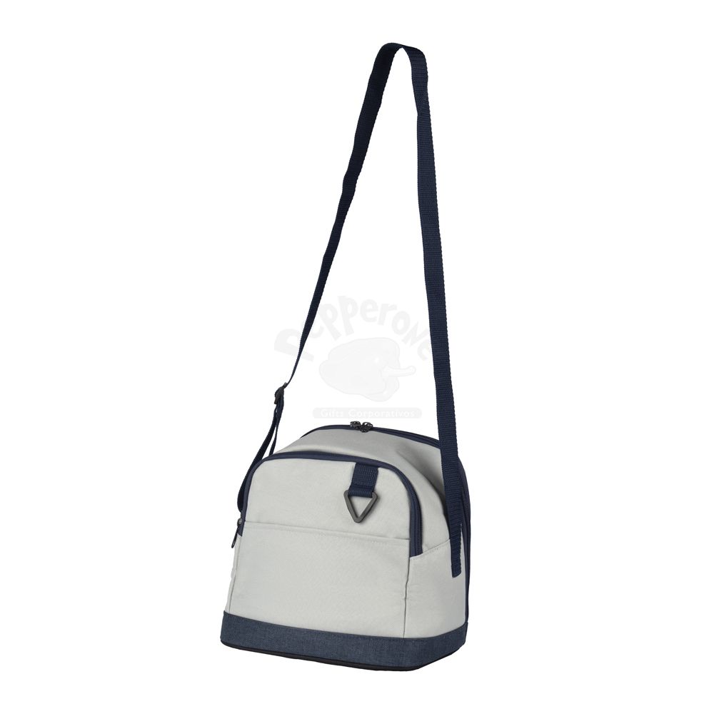 Bolsa térmica em tecido poliéster 600D com bolso frontal, argola plástica para chave e dois acessos ao compartimento interno. Possui alça de transporte com regulagem e parte interna soldada para melhor conservação térmica.