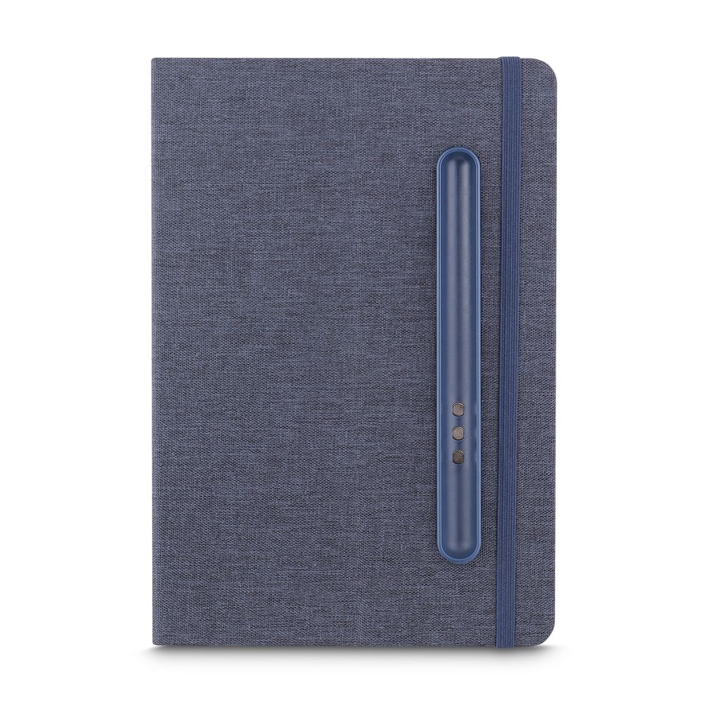 Caderno produzido com capa em tecido RPET e suporte para caneta, capa dobrável para suporte de smartphone, miolo com 80 folhas pautadas. *Não acompanha caneta.