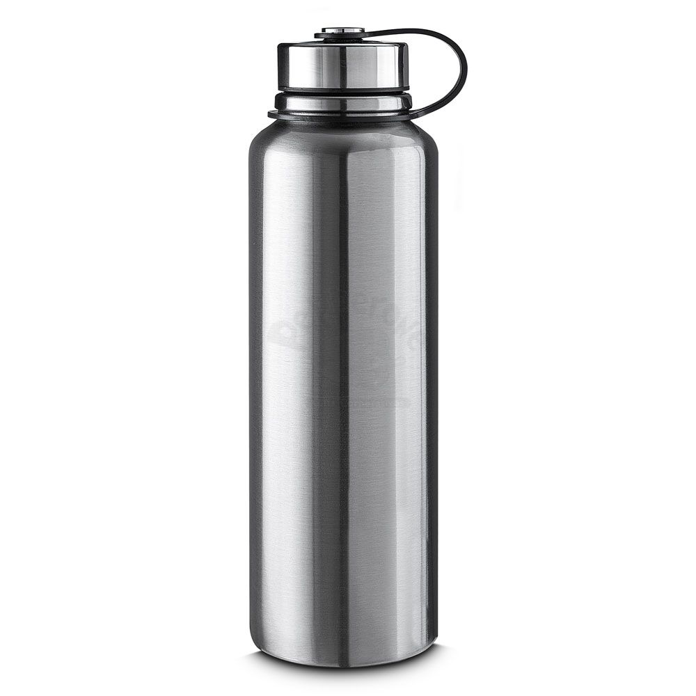 Garrafa térmica em aço inox com parede dupla com capacidade de 1L,tampa em aço inox rosqueável com anel de silicone para vedação com alça em plástico.