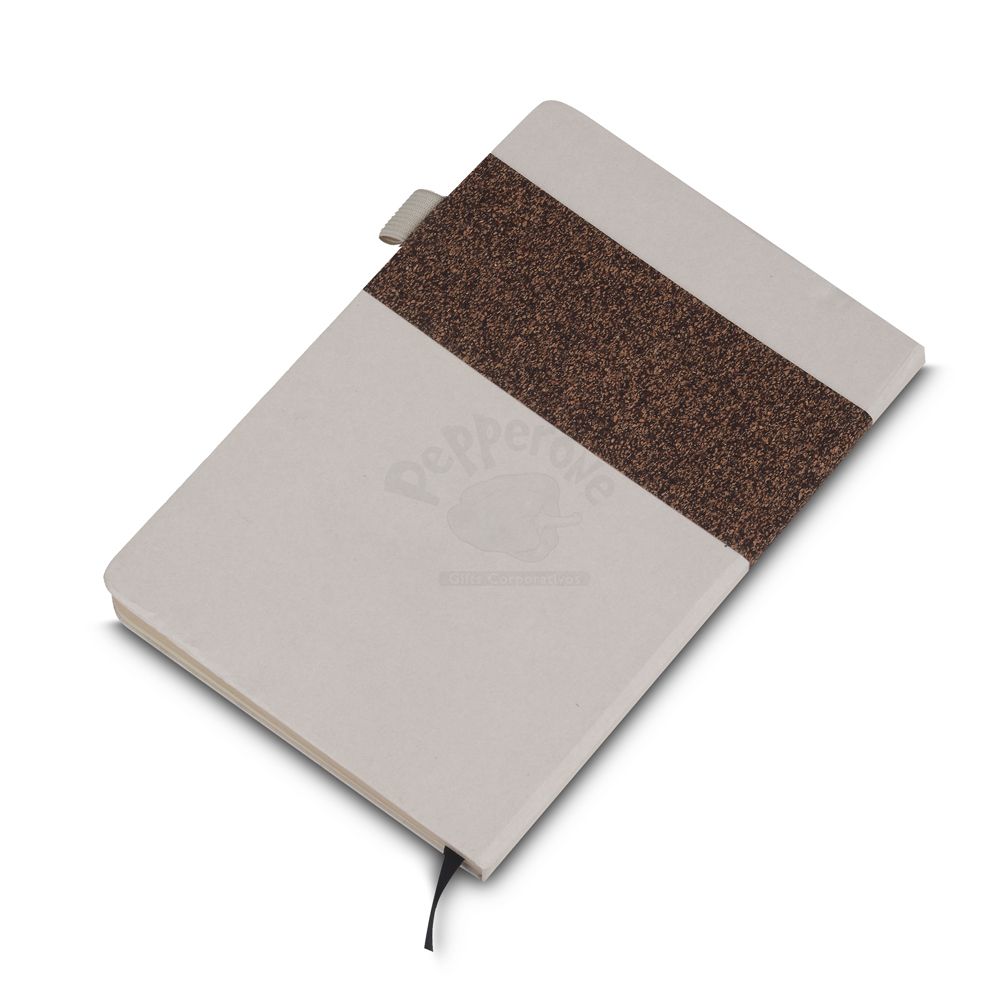 Caderno de anotações, capa em fibra de açúcar e tecido RPET com suporte para caneta, miolo com 80 folhas pautadas na cor bege.