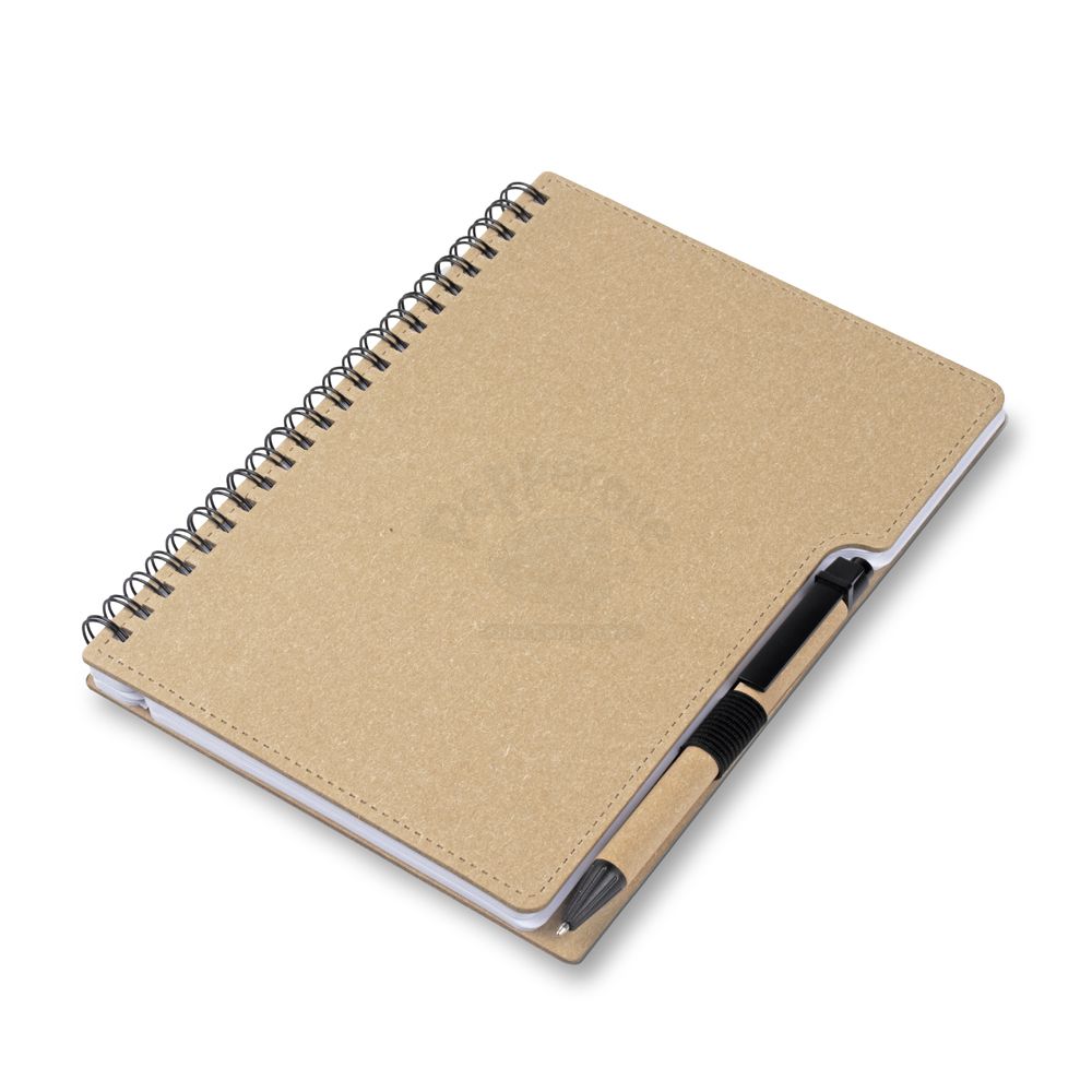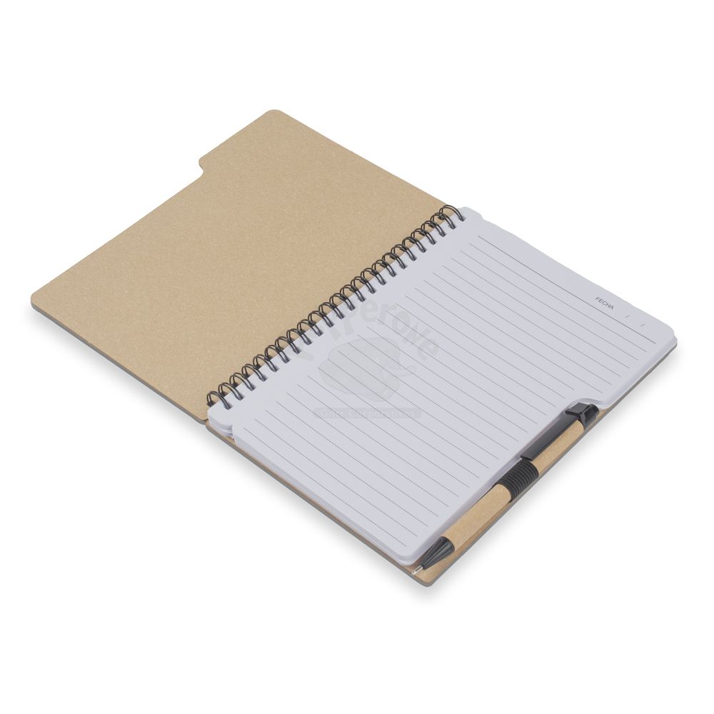 Caderno de anotações em papelão reciclável com suporte para caneta e miolo de 70 folhas pautadas e destacáveis. Acompanha caneta com corpo em papel reciclável com detalhe em plástico.