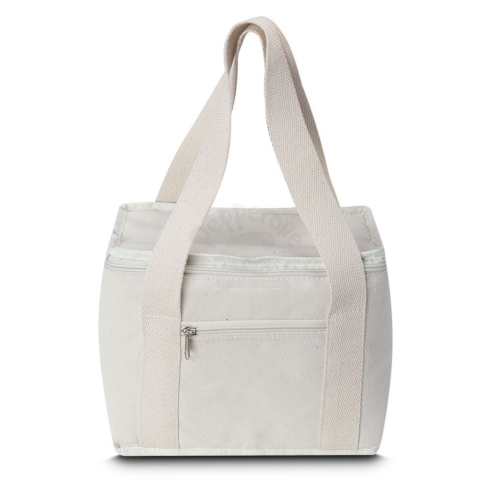 Bolsa térmica em algodão cru, bolso frontal, alça de mão, compartimento interno soldado.