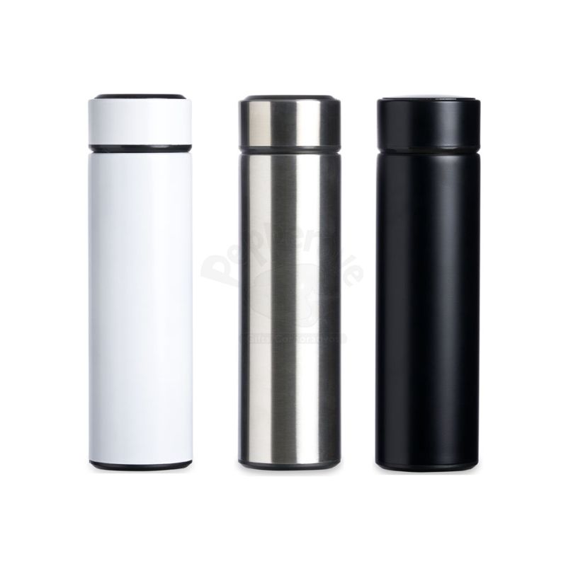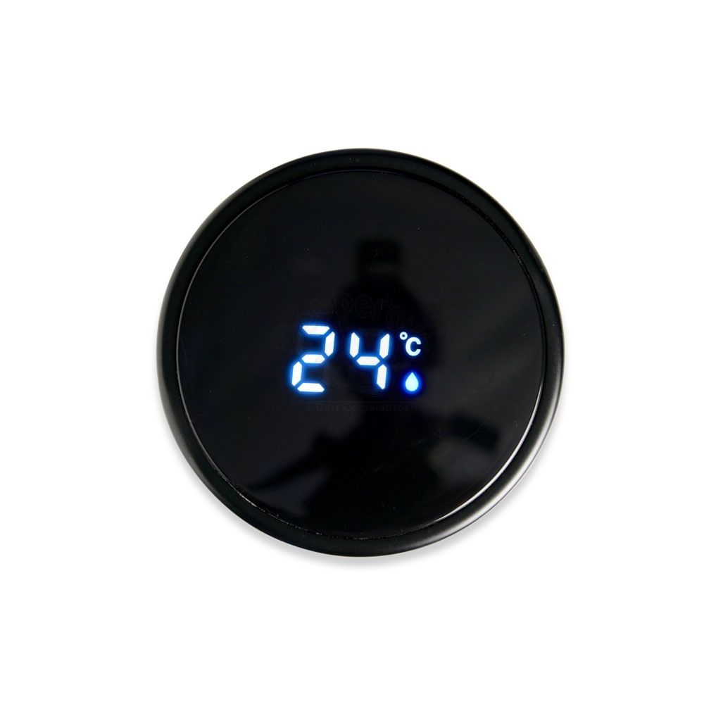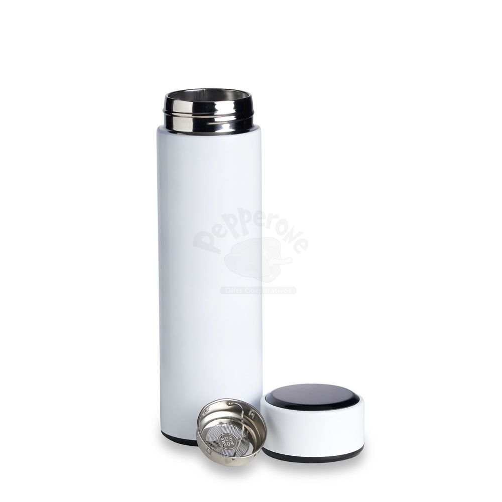 Garrafa térmica personalizada com capacidade para 450ml. Possui parede dupla em aço inox, tampa com visor em LED e termômetro digital que permite com um simples toque saber a temperatura do líquido no interior do garrafa. Incluso na tampa um sistema de fácil acesso à bateria para substituir quando necessário. Ideal para brindes promocionais e eventos corporativos. Imagem ilustrativa.