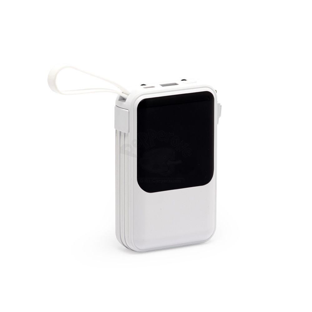 Carregador power bank de 10.000mAh com lanternas e múltiplas saídas. Fabricado em plástico com display integrado, este power bank vem equipado com quatro cabos de carregamento, eliminando a necessidade de transportar cabos extras. Compatível com entradas V8, Tipo-C, Lightning e USB, praticidade é o sinônimo deste carregador. Com alça de borracha e um tamanho compacto para um transporte discreto, ele possui uma capacidade real de 6.000mAh para manter os dispositivos sempre carregados. Acompanha cabo USB-V8.