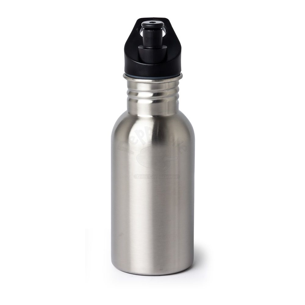 Squeeze inox com capacidade 550ml. Possui tampa rosqueável com bico plástico e alça integrada.