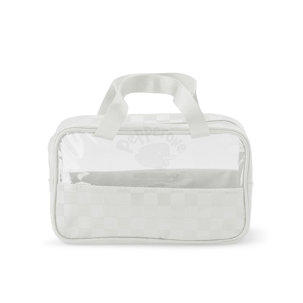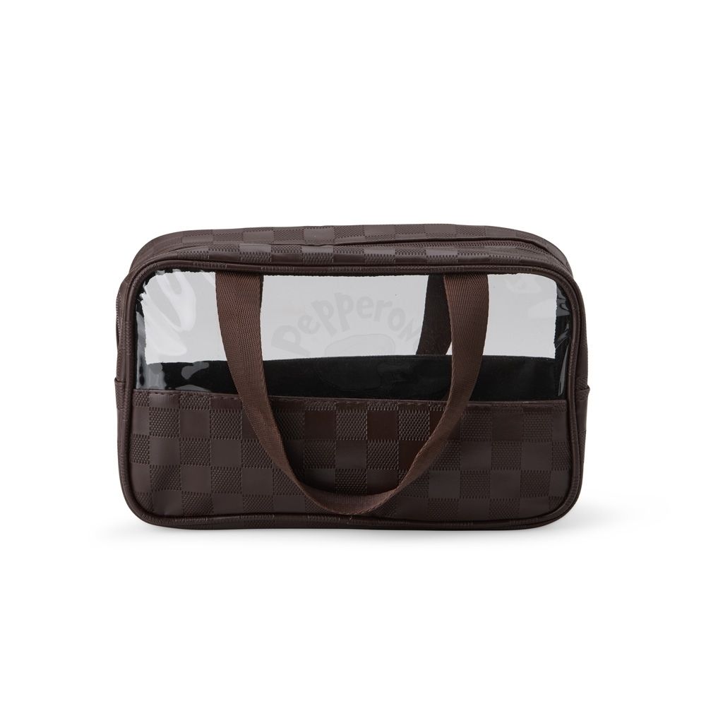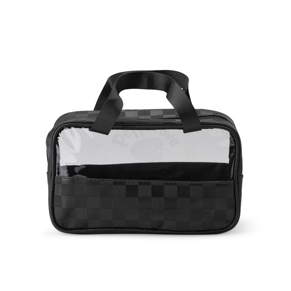 Nécessaire de PVC e couro sintético impermeável em xadrez . Possui visor transparente e duas alças laterais de mão em nylon.