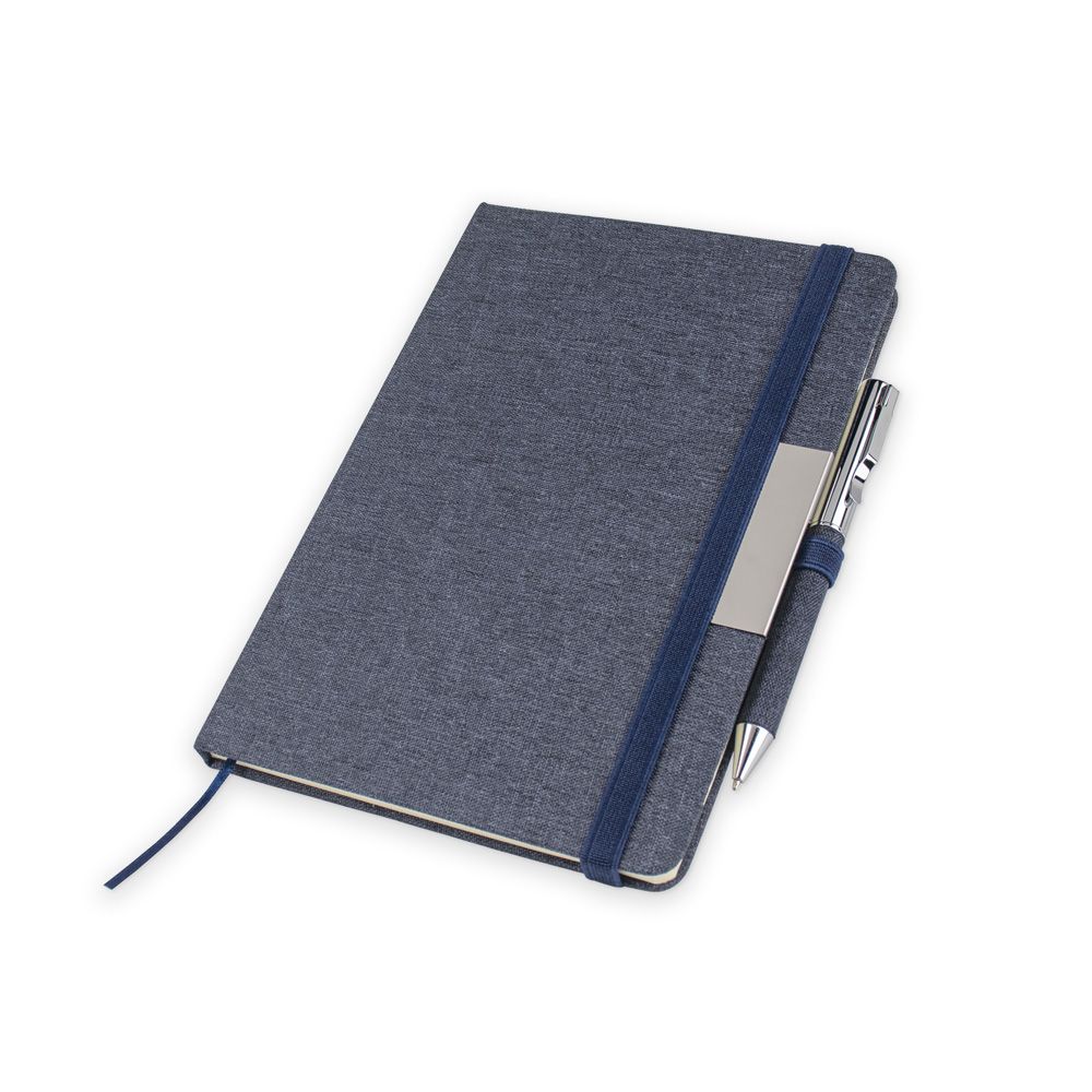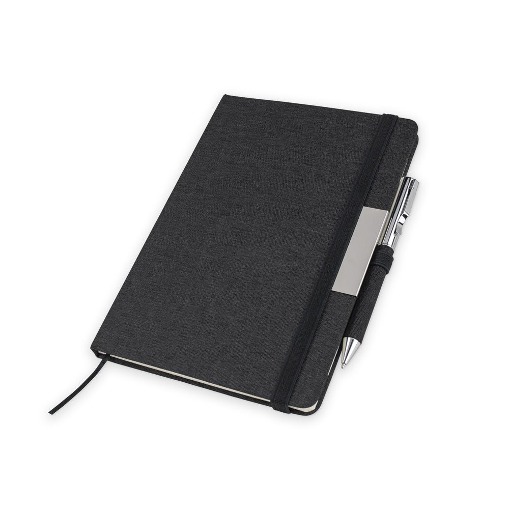 Neste kit o caderno de anotações é feito de PET Reciclado, em capa dura com miolo 80 folhas pautadas, acompanha berço presentável e caneta metálica.