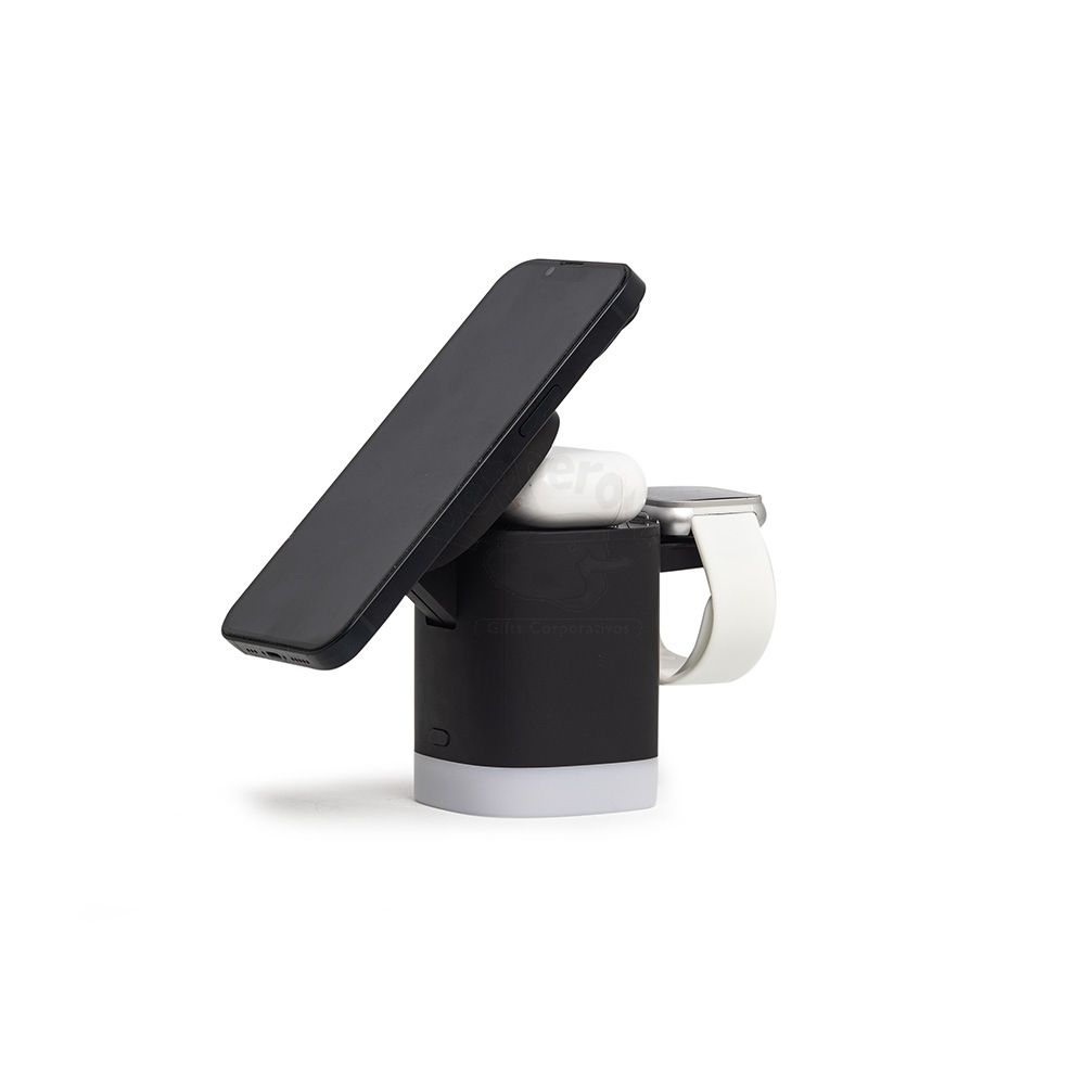 Carregador 3 em 1? A nossa base de carregamento é diferenciada, já que possui indução para relógio, fones e celular, e você pode usá-los todos ao mesmo tempo, basta que o celular e demais dispositivos tenham a tecnologia QI. O LED RGB possui 2 modos, luz branca e vermelho, verde e azul se alternando. A base não armazena energia, portanto, precisa estar conectada ao cabo tipo-C que a acompanha.