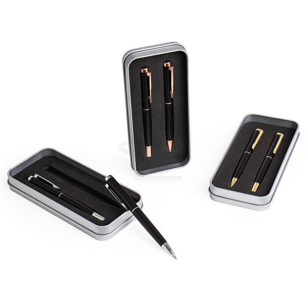 Descubra nosso sofisticado kit de caneta e roller metálicas, perfeito para quem valoriza estilo e funcionalidade. Com acabamento fosco, a caneta possui acionamento por rotação e carga esferográfica azul de 1.0mm, garantindo uma escrita suave e precisa. O roller, com carga de 0.7mm, oferece um traço delicado e fluido. Acompanha um estojo de metal revestido em espuma, que protege e exibe suas canetas com elegância.