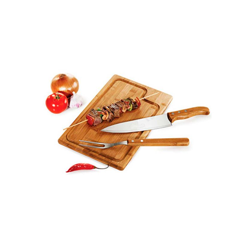 Kit churrasco com 3 peças em inox e cabo de bambu. Acompanha tábua para corte.