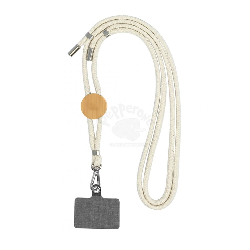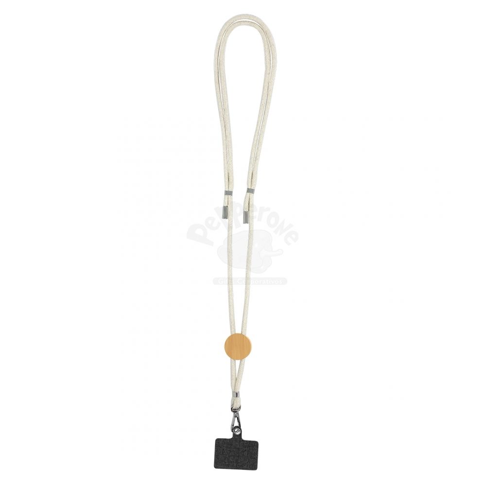 Cordão de pescoço para celular em algodão reciclável e placa de gravação em bambu.