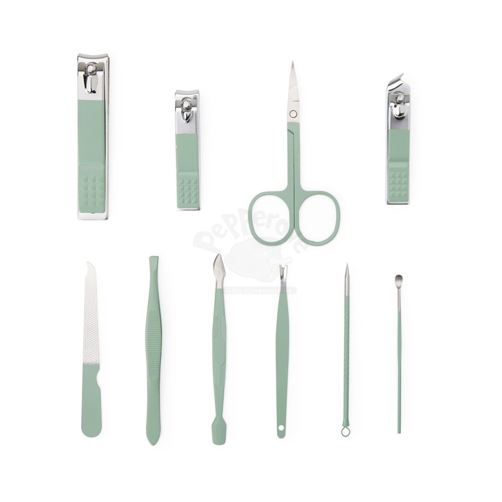 Kit Manicure 10 peças em estojo de couro sintético, perfeito para embelezar e cuidar das unhas, podendo ser usado em casa ou em salões de beleza. Com três cortadores de unha, tesoura, lixa, pinça, empurrador de cutícula, removedor de cutícula, palito de unha e espátula para ouvido, este kit oferece tudo o que precisa para manter as unhas e cuidados sempre em dia.