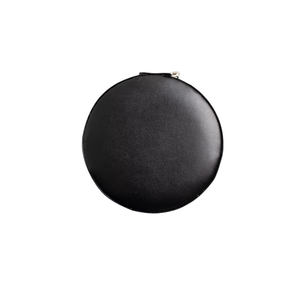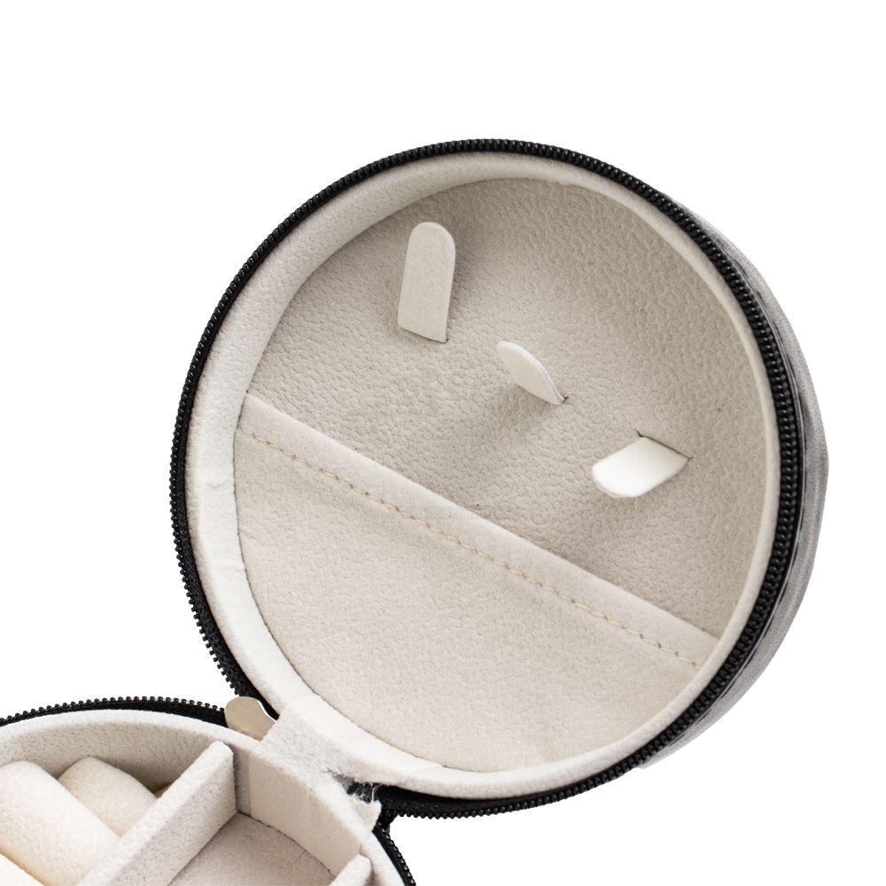 Porta-joias de couro sintético com revestimento aveludado. Possui compartimentos internos para anéis, brincos, pulseiras e colares.